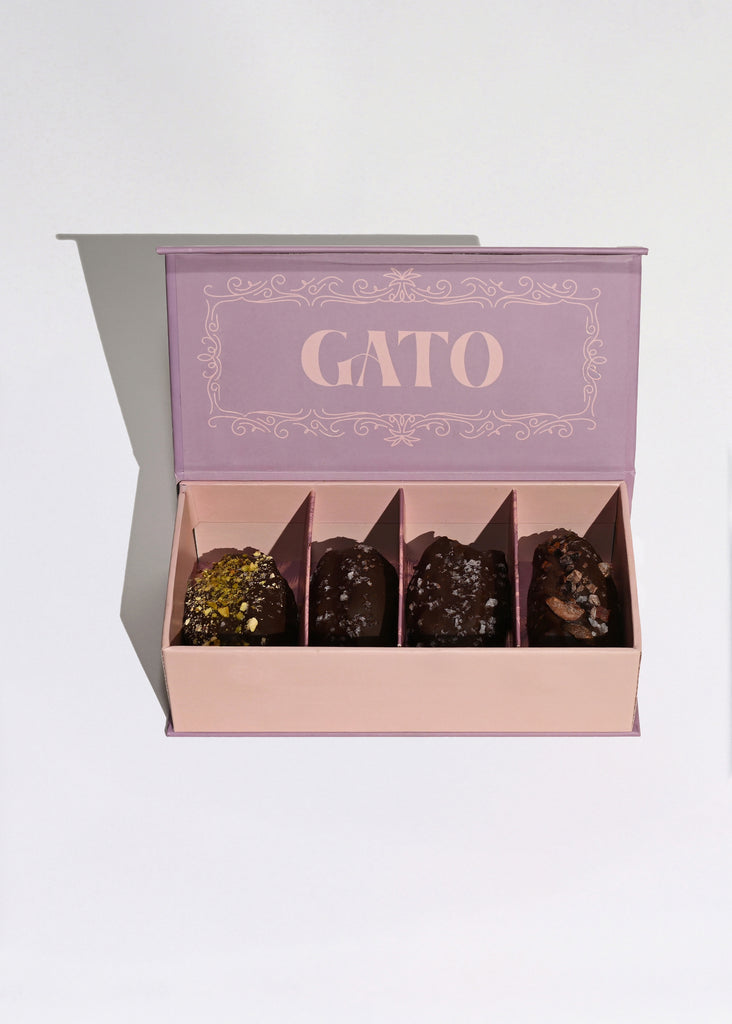 Each the Gato Dates Gift Box comes with four dates: Pistachio Butter (1) , Cashew Butter & Walnut (2) and Almond Butter (1).