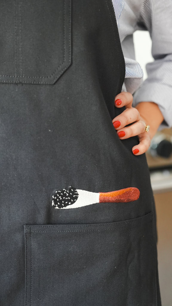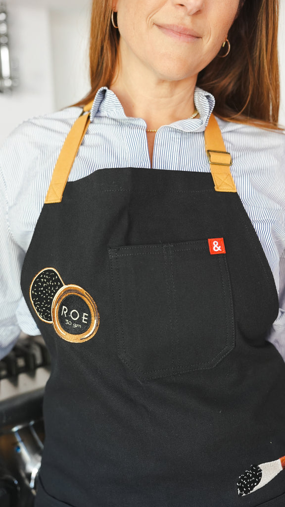 Nothing basic about this black apron. The gold straps and black body are complimented by embroidery of ROE's iconic caviar tin and mother of pearl spoon.